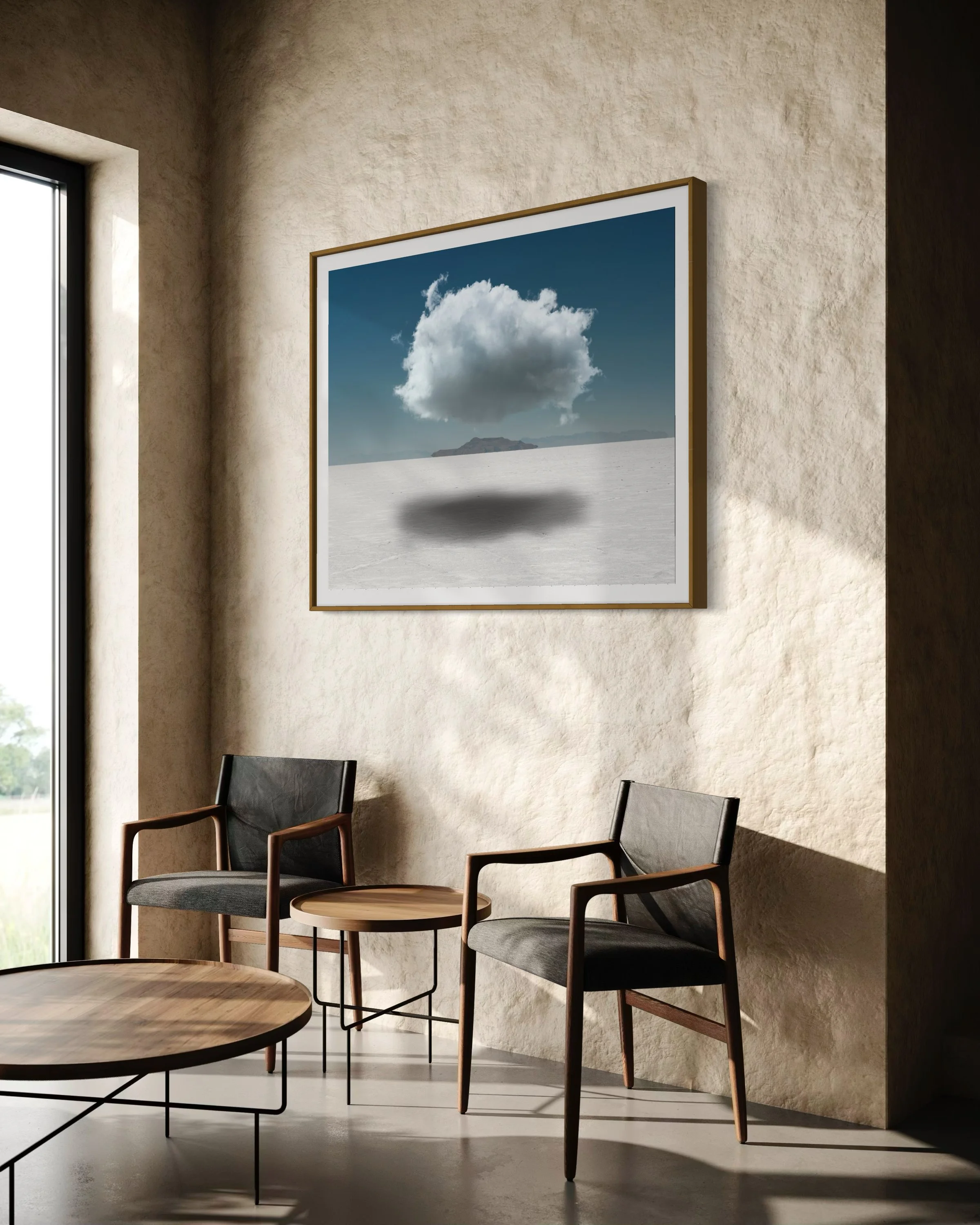 A single cloud floats above an endless white plain. It casts a perfect shadow on the earth below—soft, still, unmistakable. The scene is quiet, but it holds weight. The kind of stillness that asks something of you.