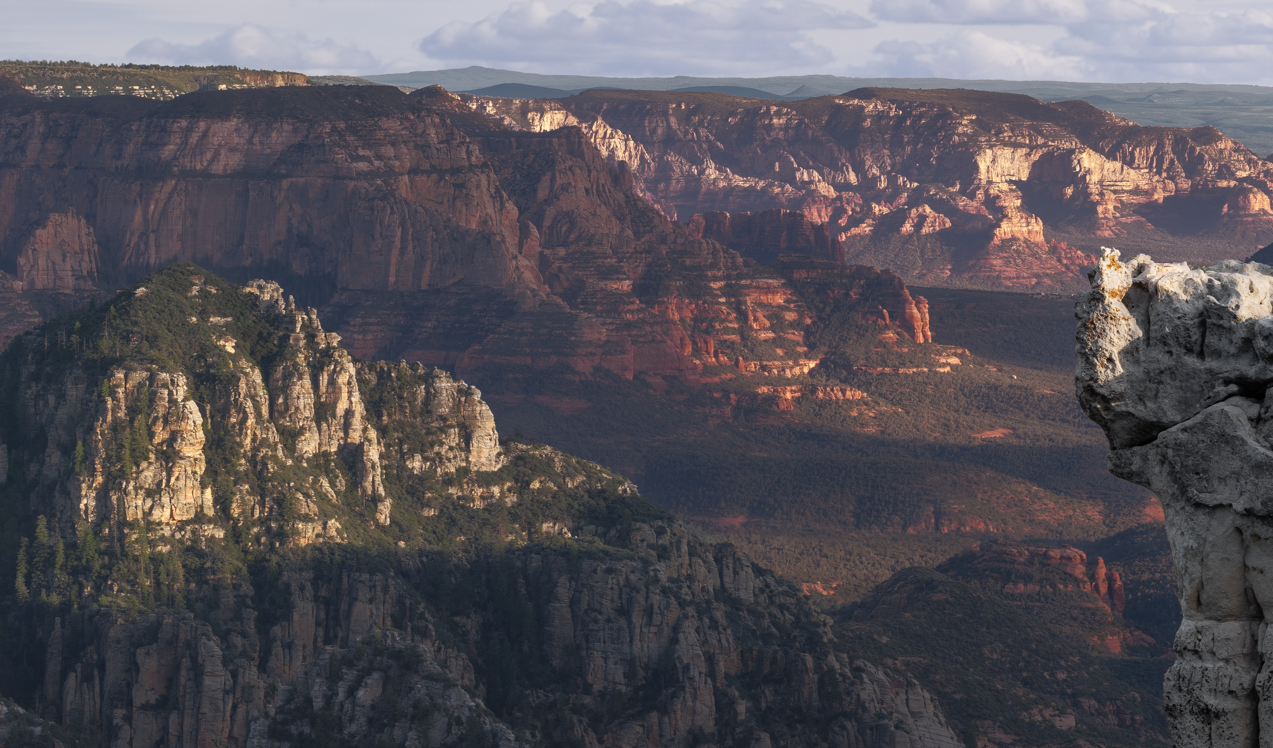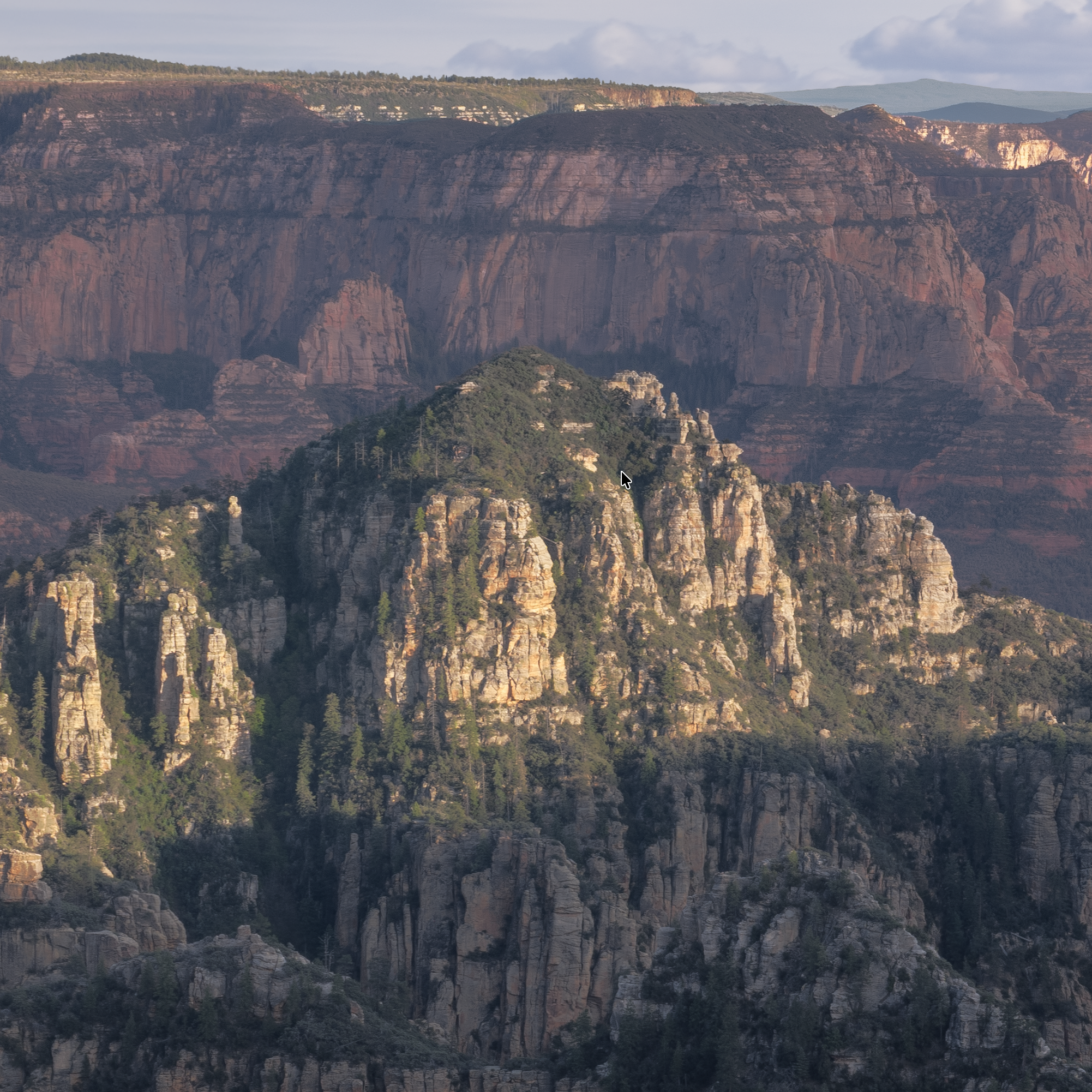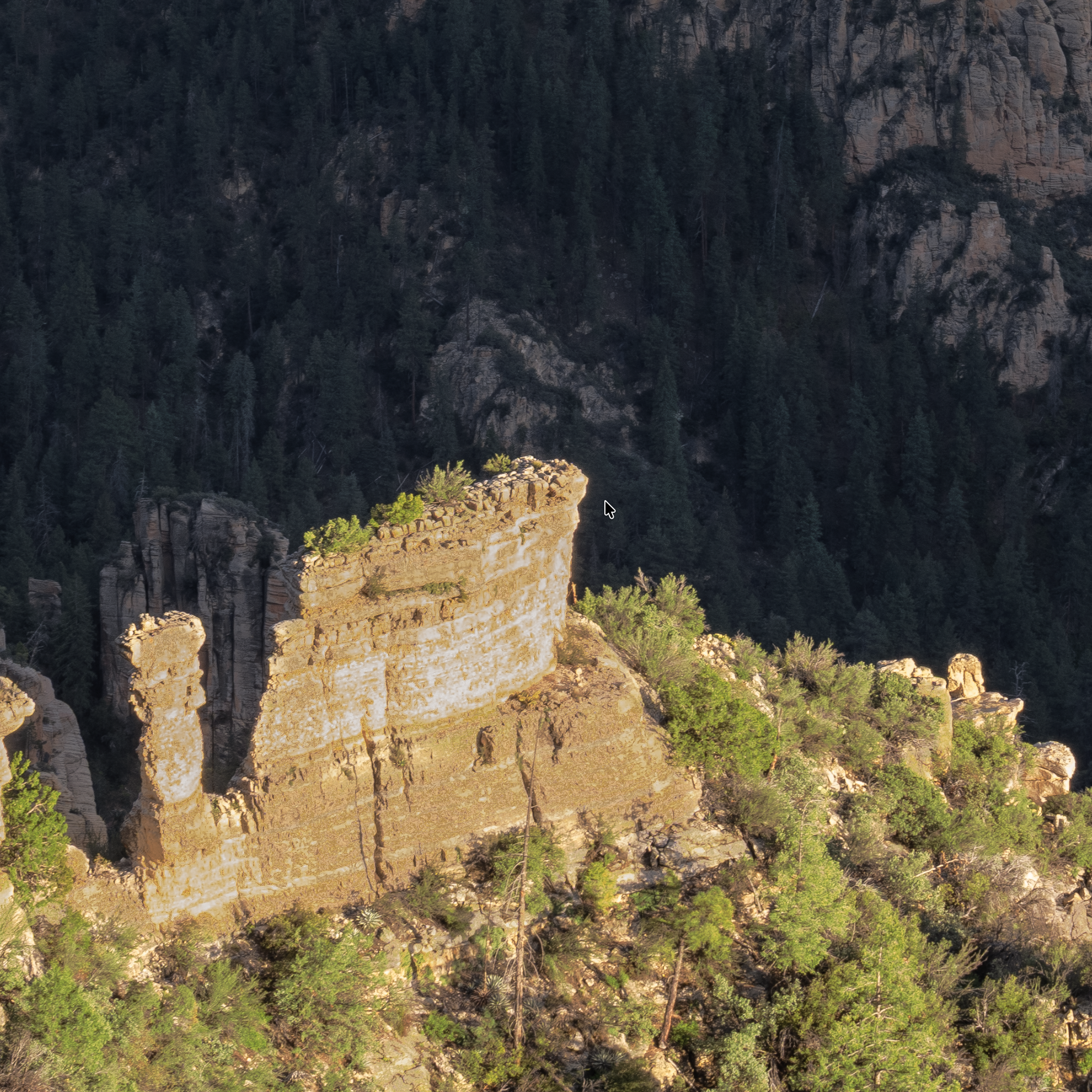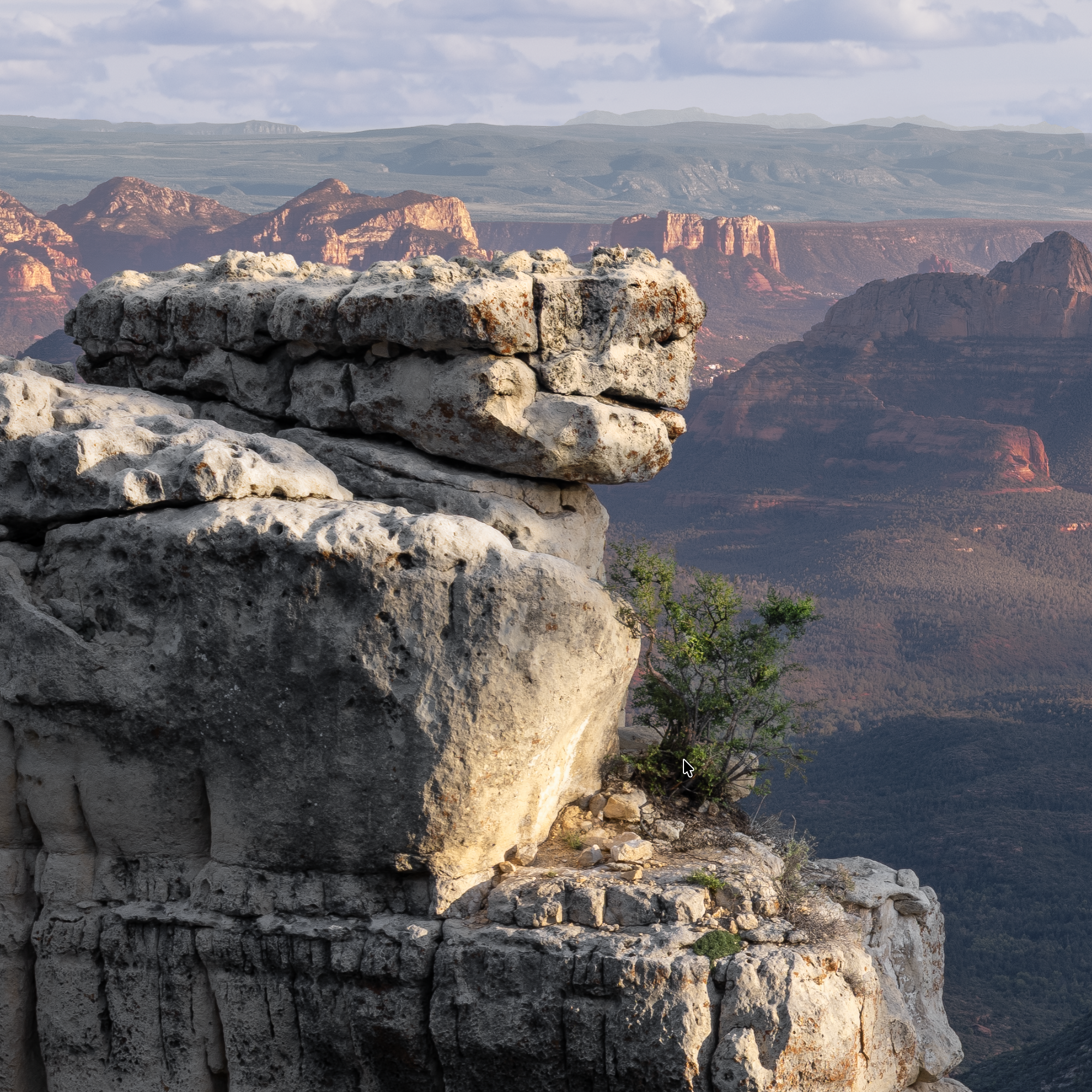 This piece was photographed in the East Pocket, the high country between Sedona and Flagstaff, at an overlook locally called "The Edge of the World." The spire at the center is known as Jenga Rock — a weathered limestone formation that holds its narrow shape against the canyon below.